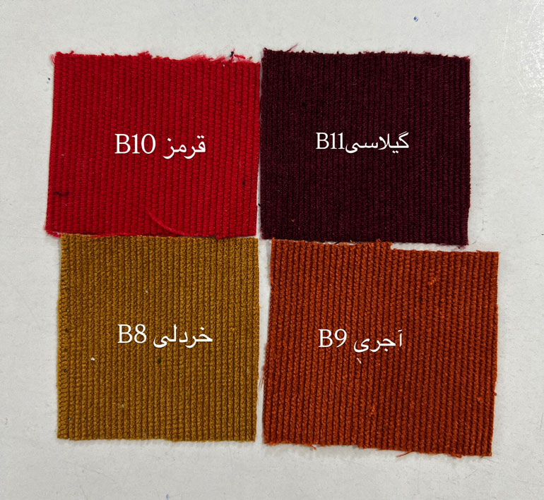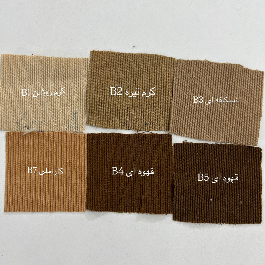آبی B17 ,آجری B9 ,خردلی B8 ,سبز ارتشی B13 ,سبز ارتشی B14 ,سبز پاستیلی B12 ,سرمه ای B16 ,سفید B19 ,قرمز B10 ,قهوه ای B4 ,قهوه ای B5 ,کاراملی B7 ,کرم تیره B2 ,کرم روشن B1 ,کله غازی B15 ,گیلاسی B11 ,مشکی B18 ,نسکافه ای B3 |