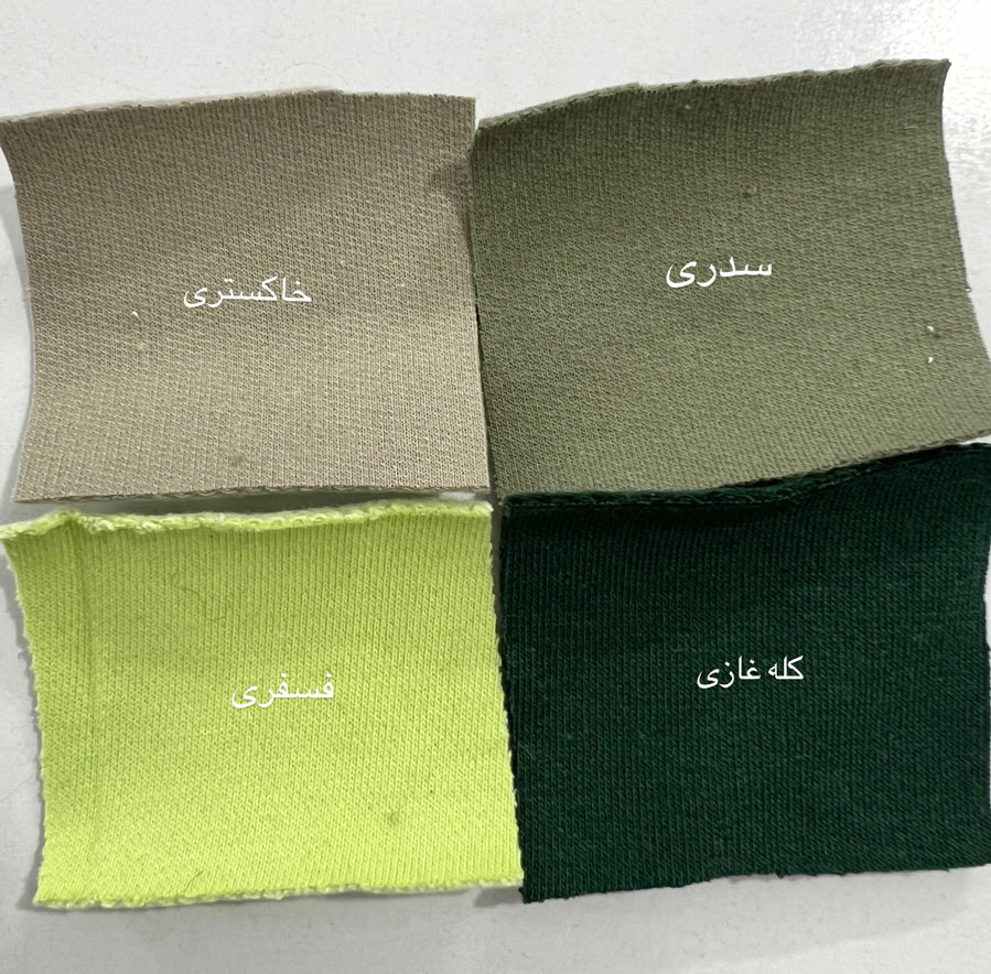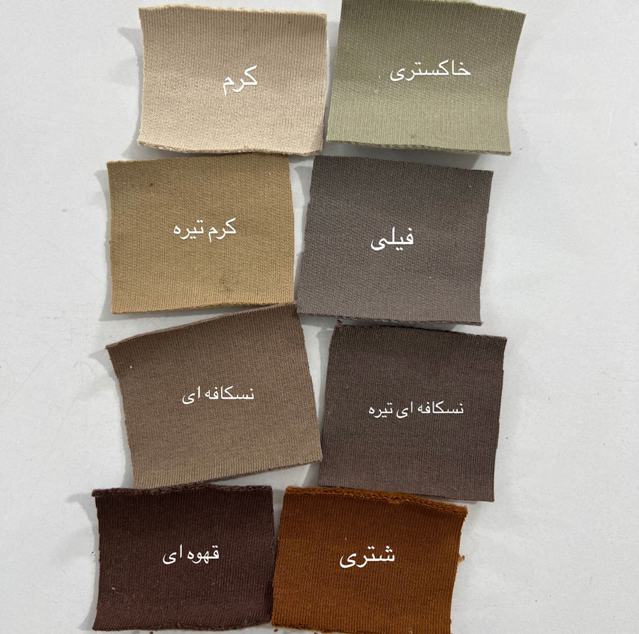 آبی آسمانی D18 ,آبی کاربنی D23 ,آجری D15 ,بنفش D16 ,خاکستری D9 ,سدری D21 ,سفید D1 ,سورمه ای D19 ,شتری D6 ,صورتی باربی D12 ,صورتی روشن D11 ,طوسی D10 ,فسفری D13 ,فیلی D8 ,قرمز D24 ,قهوه ای D5 ,کرم D2 ,کرم تیره D3 ,کله غازی D22 ,لیمویی D14 ,مشکی D20 ,نسکافه ای D4 ,نسکافه ای تیره D7 ,یاسی D17 |