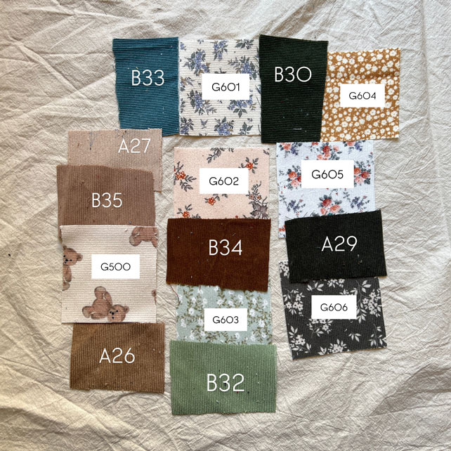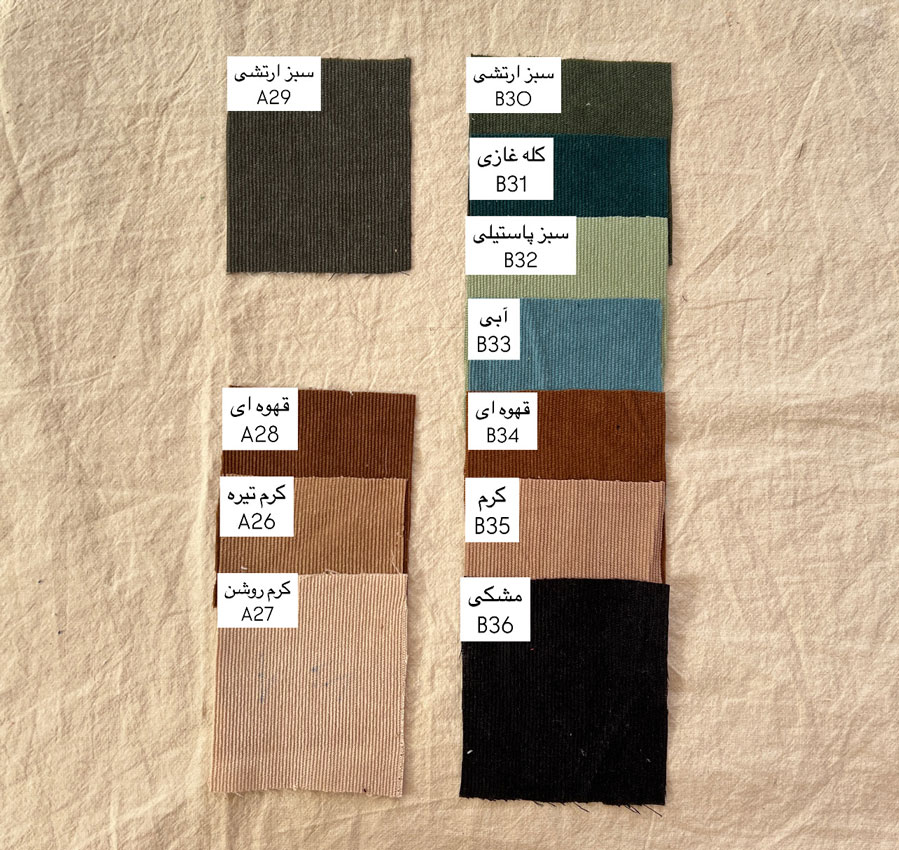 آبی B33 ,تدی G600 ,سبز ارتشی A29 ,سبز ارتشی B30 ,سبزپاستیلی B32 ,قهوه ای A28 ,قهوه ای B34 ,کرم B35 ,کرم تیره A26 ,کرم روشن A27 ,کله غازی B31 ,گلگلی خردلی G604 ,گلگلی سبز پاستیلی G603 ,گلگلی سبزتیره G606 ,گلگلی سفید G605 ,گلگلی شیری G601 ,گلگلی گلبهی G602 |